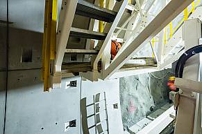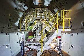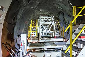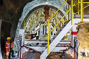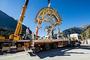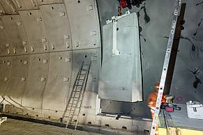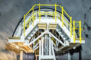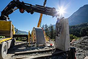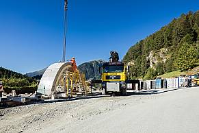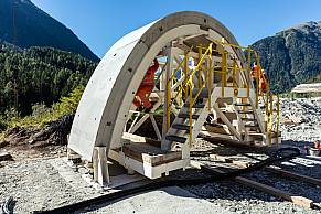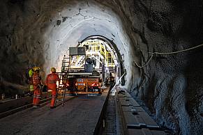 The Bever-Scuol-Tarasp railway line is a narrow metre gauge railway. Built at the beginning of the 20th century, it is operated by the Rhaetian Railway. This line includes the Sasslatsch connecting tunnel between Susch and Lavin, which was renovated from 2016 to June 2017 with a new "tunnel-in-a-tunnel" method. The old vault walling was excavated, the tunnel was widened, re-anchored and fixed with shotcrete. The tunnel was then lined with sealed precast concrete elements and filled in with gravel.